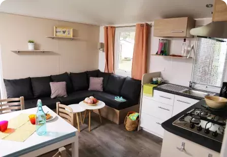 For a slightly bigger option, the Bien-être holiday home provides 36m² to 45m² of living space, with a choice of 2 or 3 bedrooms, sleeping up to 6 or 8 people. There's a fully equipped kitchen and sofa in the living room for a really comfy stay.